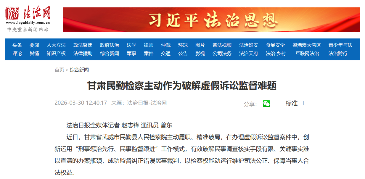 3月30日,“法治网”刊发《甘肃民勤检察主动作为破解虚假诉讼监督难题》,现予以转载。