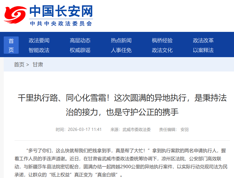3月17日,中央政法委门户网站“中国长安网”刊发《千里执行路、同心化雪霜!这次圆满的异地执行,是秉持法治的接力,也是守护公正的携手》,聚焦武威市政法系统着力破解执行难题生动实践,现予以转载。