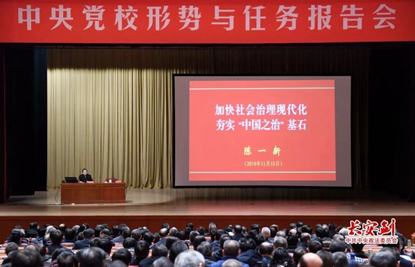 11月15日,中央政法委秘书长陈一新应邀至中央党校,在形势与任务报告会上以《加快社会治理现代化夯实“中国之治”基石》为题,为全体在校学员作专题报告。